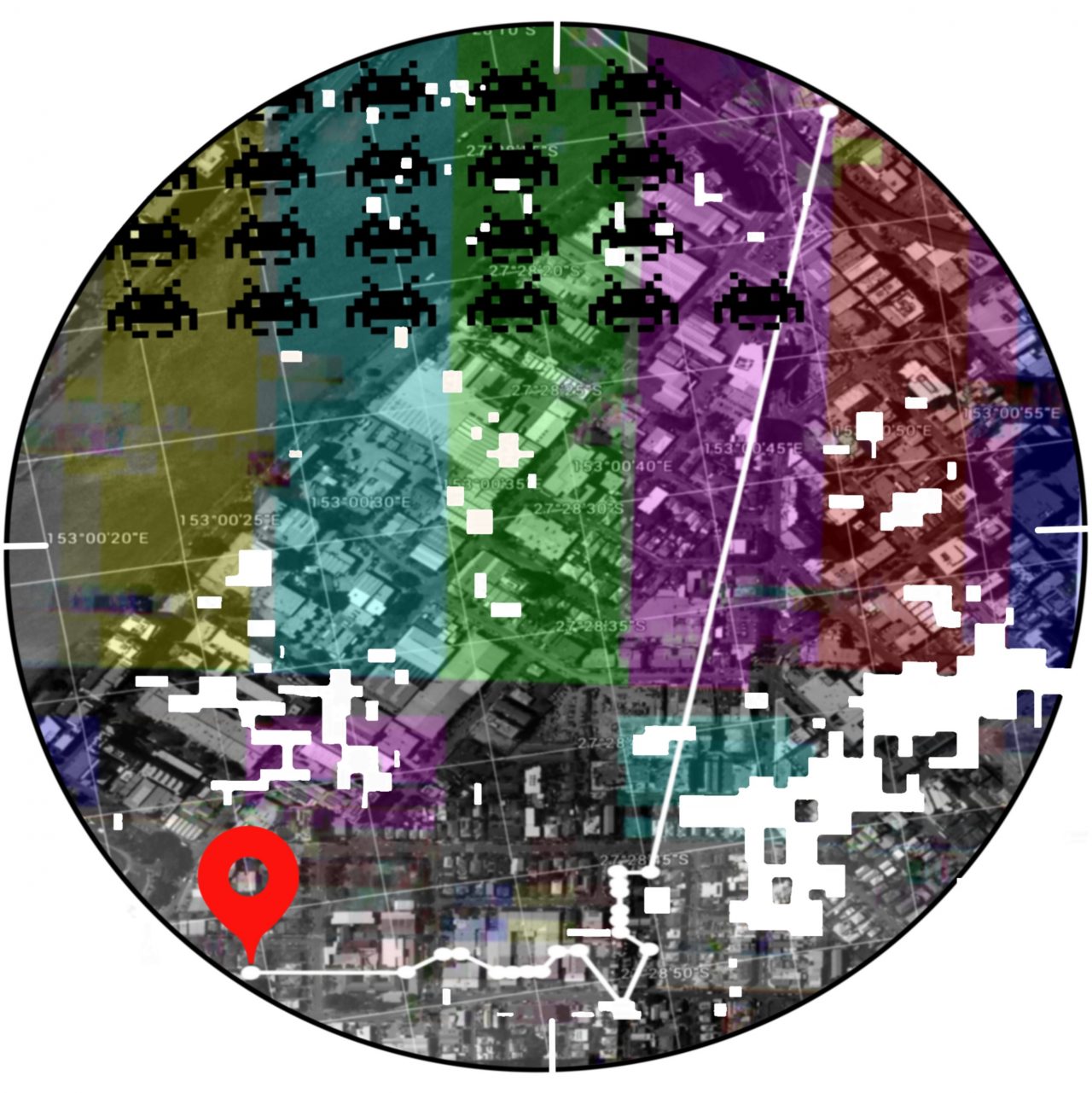 In the design I have layered all imagery from surveillance practices which are available through the internet, to speak to the trace or memory attached to land. Imagery layers include: South Brisbane/ West End map of the trace exhibition region, smpte test screen calibration, pixelation glitches, and space invaders characters.