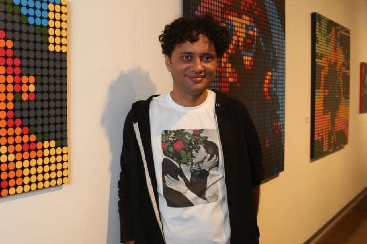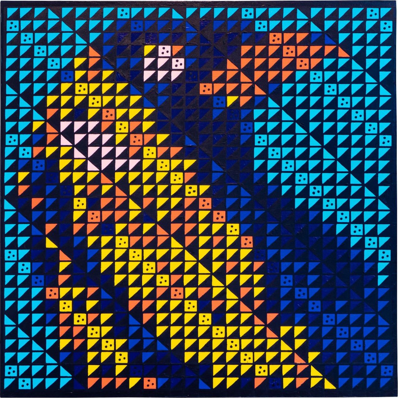 Tupou’s works use proximity and distance to alter the viewers perception, up close the works appear to be an abstract assemblage of geometric shapes and colours, whilst at a distance an 8-bit halftone image takes shape. The artworks are inspired by mathematical geometry and 1980’s video game imagery as well as Pacific Island Tapa cloth design and fine mat weaving.